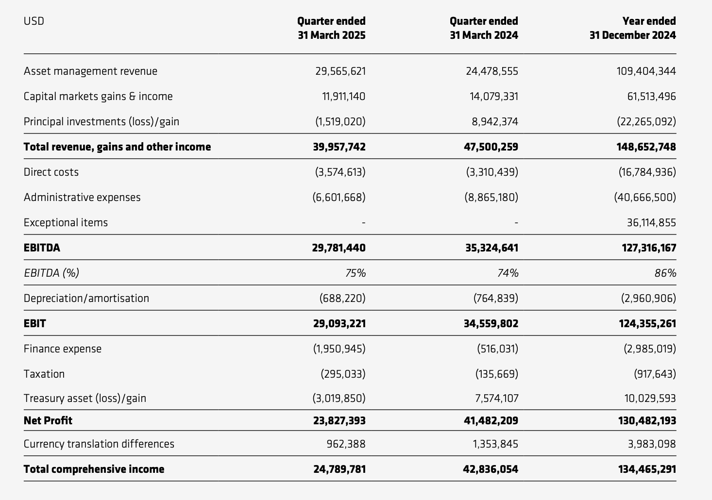在占比最高的资管业务上,CoinShares 一季度录得 2956.6 万美元收入,占总收入的约 74%,同比增长约 20.8%。除去直接成本和行政费用后的利润约 2271.4 万美元,同比小幅增长约 5%。
